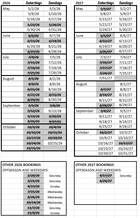 Below is the current availability for our In-Season WEEKEND WEDDING EXPERIENCES and SUNDAY WEDDINGS.